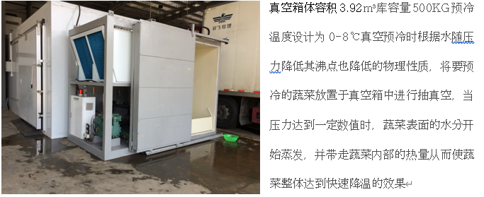 一卡板果蔬真空預冷機主要針對小型蔬菜加工中心的預冷使用;真空箱容積3.92m3,庫容量500kg,預冷溫度設計為0~8℃;