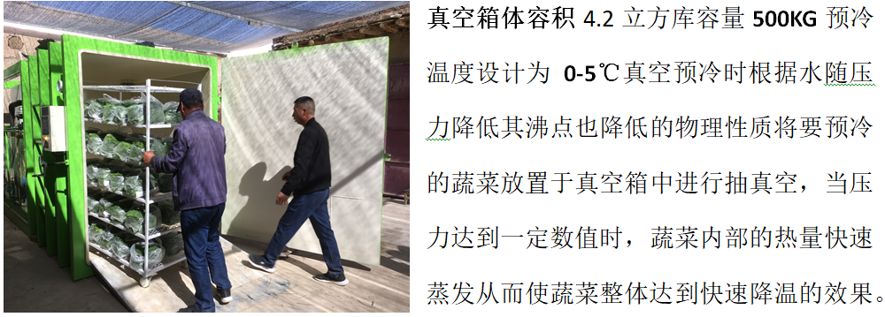 一卡板果蔬真空預冷機主要針對小型蔬菜加工中心的預冷使用;真空箱容積3.92m3,庫容量500kg,預冷溫度設計為0~8℃;