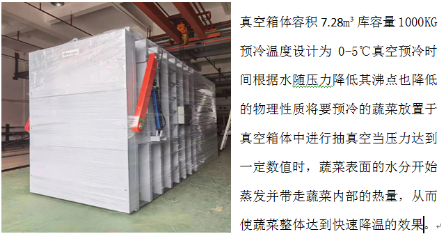 一卡板果蔬真空預(yù)冷機(jī)主要針對(duì)小型蔬菜加工中心的預(yù)冷使用;真空箱容積7.28m3,庫(kù)容量1000kg,預(yù)冷溫度設(shè)計(jì)為0~8℃;