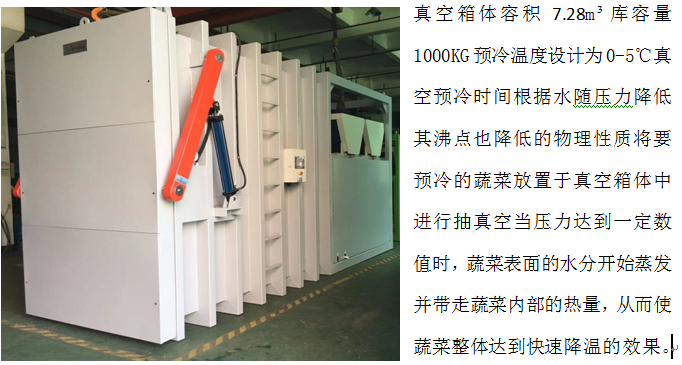 二卡板果蔬真空預冷機主要針對小型農場的預冷加工使用;真空箱容積7.28m3,庫容量1000kg,預冷溫度設計為0~10℃;