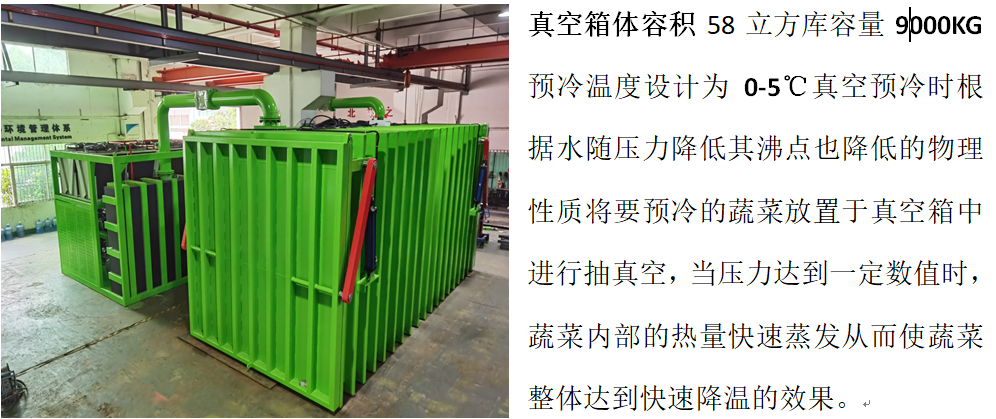 18卡板果蔬真空預冷機主要針對小型農場的預冷加工使用;真空箱容積57m3,庫容量9000kg,預冷溫度設計為0~5℃;