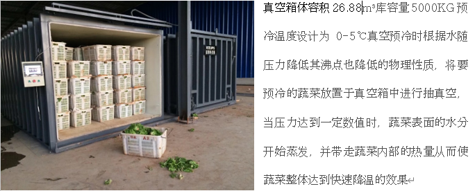 真空預冷設備是一種冷卻加工設備,不是冷藏設備。它的用途只是讓果蔬迅速冷卻到設定的溫度,然后就從設備中將物品取出,或直接運輸,或放入冷庫。因果蔬處于休眠狀態(tài),其生命力的恢復需要時間過程,這一過程就是保鮮期。