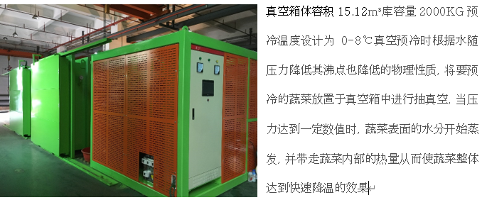 4卡板果蔬真空預冷機主要針對小型農(nóng)場的預冷加工使用;真空箱容積15.12m3,庫容量2000kg,預冷溫度設計為0~8℃;